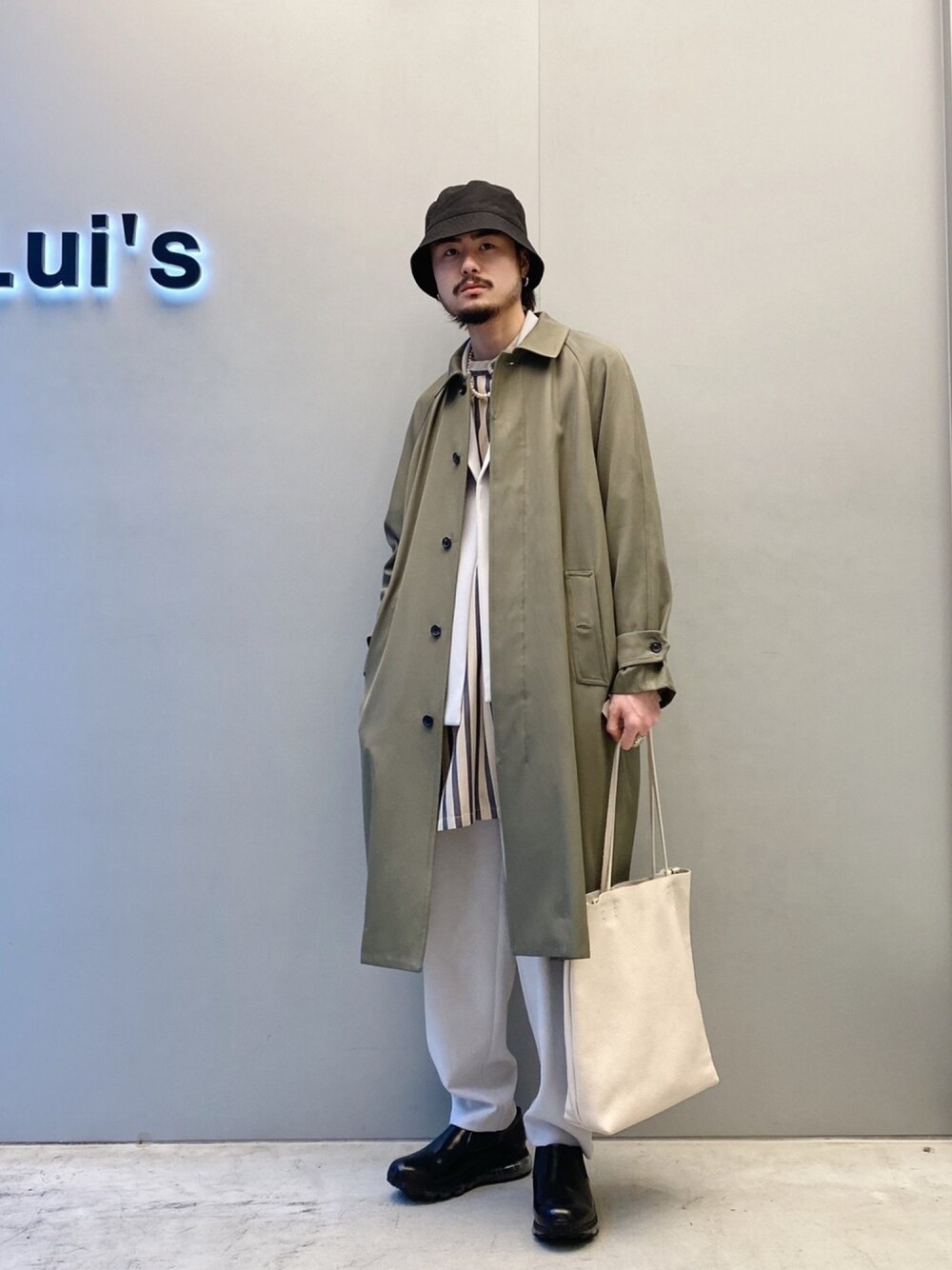 KOU SUEMATSU(Lui's/EX/store TOKYO)のステンカラーコート「コットンギャバツイルバルマカーンコート」を使ったコーディネート