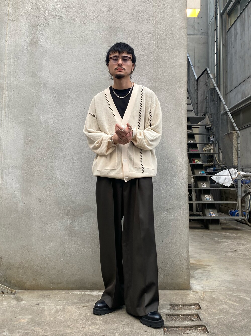KOU SUEMATSU(Lui's/EX/store TOKYO)のカーディガン/ボレロ「ステッチ刺繍カーディガン」を使ったコーディネート