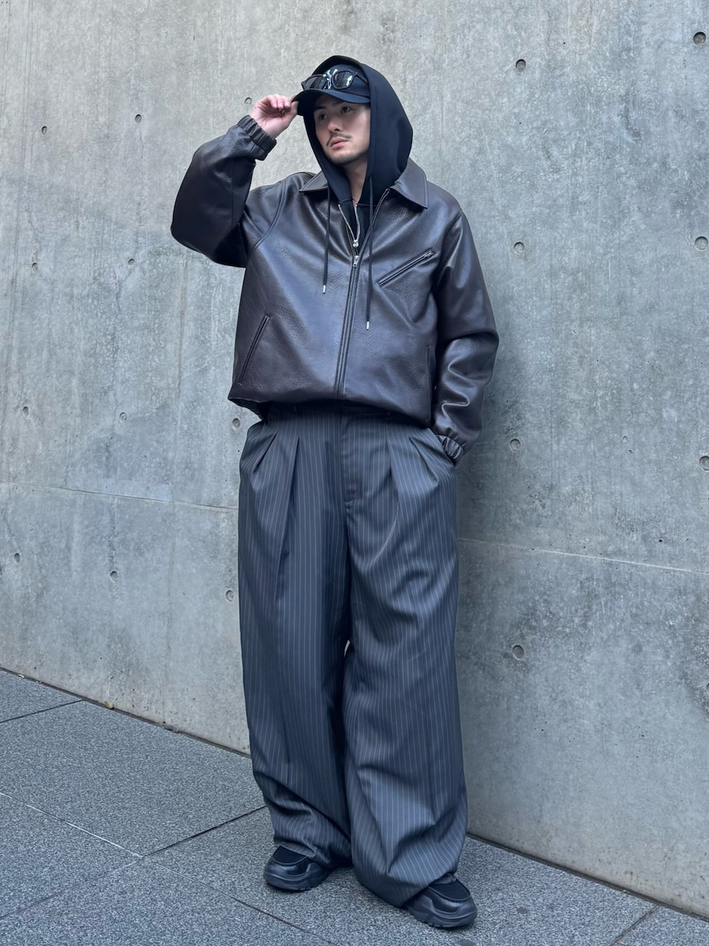 172cm 53kg / 骨格ナチュラル [レザーブルゾン] Sサイズ着用 本革っぽい見た目のシボが特徴のレザーブルゾン。 色もダークブラウンで今1番気分な色。 ダークブラウンはグレーやブラックその他いろんな色のボトムやインナーを合わせやすいのでおすすめです。 [フーディー] Sサイズ着用 フードにボリュームのあるパーカー。 軽く着れライト感がありつつもしっかりした厚みのある生地で超おすすめのパーカーです。 [パンツ] 1サイズ着用 ピンストライプで綺麗目に見えるパンツ。 素材も通年使えておすすめです。