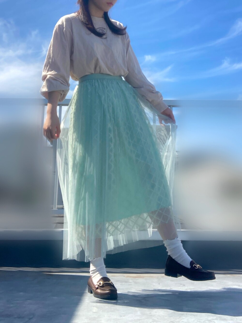 お疲れ様です(´∀`*) ベージュ×ミントってあまりしたことのない組み合わせだったんですが、着てみると可愛い💕