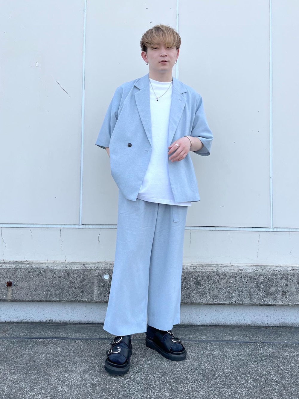 ライトブルーのセットアップ 夏でもセットアップで簡単にオシャレ出来る! 夏はシンプルになりがちなので、セットアップは強い! instagramやSTAFF BORDもやっているのでプロフのURLから見て下さい!