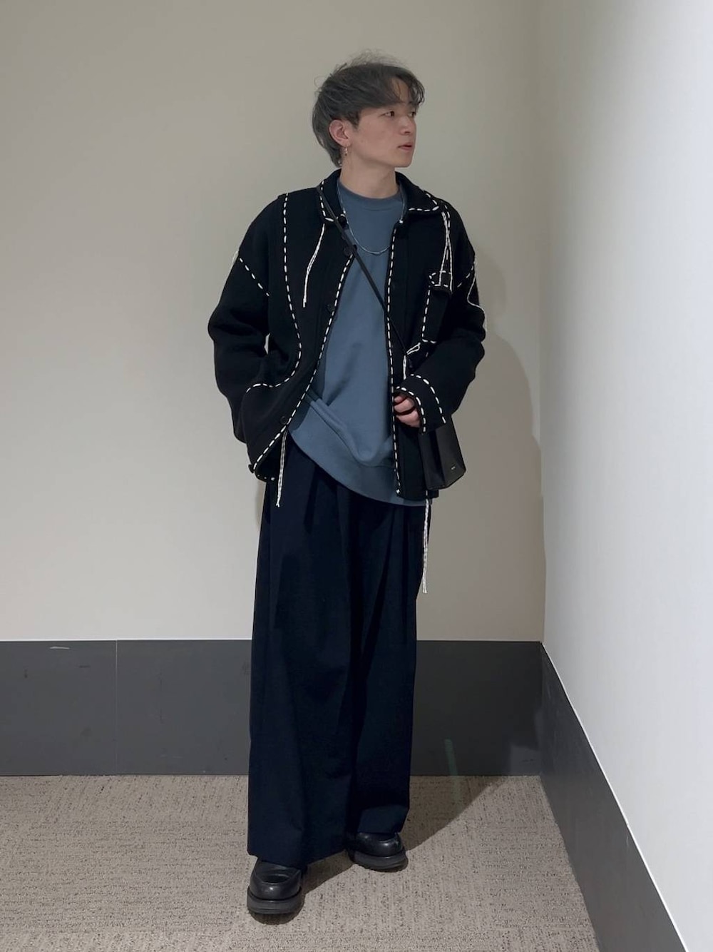 全角度の写真と動画も見れます! 顔ありと、顔なしも載せているのでスワイプして見てください🙌 【 staffboard & Instagram 毎日更新中!!】Instagram(@mrti_0130)で プライベートやリール動画も配信してます! そちらもフォローお待ちしてます! ◇ネイビー×ブルーで寒色スタイル! スウェットにシャツニットを羽織るスタイル! オーバーサイズのステッチシャツはスウェットなど厚手なものにも羽織れるので春アウターとして使える! チクチクもしない生地で肌が弱い人にもオススメです! 今年はワイドめなスラックスと合わせてゆるっと着るのがカッコ良い!! キレイめ好きな方からカジュアル好きな方まで幅広く気に入ってもらえる組み合わせです!