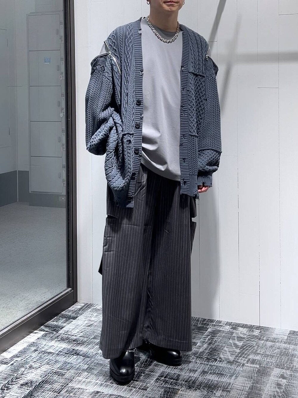 くすみカラーのワントーンコーデ! ▼カーディガン ションダーのジップはスタイリッシュでモードな雰囲気! 生地は軽いのでサラッと着やすいですし、シーズンを通して使うことができます! オーバーサイズなのでゆったりと着たい方にもオススメですよ! ▼ワイドパンツ カットアウトデザインが特徴的なパンツ! サラッとした生地なので、シーズンを通して使いやすい! 肌見せも程よいので、気にせず使っていきやすいですよ! ストライプは縦に長く見せてくれるので、スタイルアップにも繋がります!
