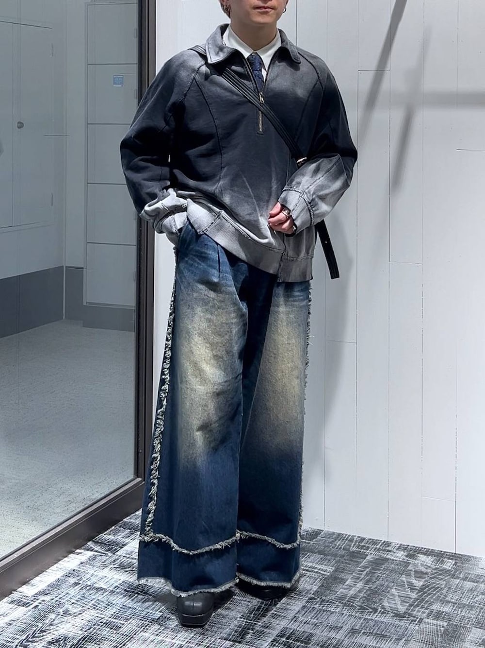 ▼スウェット サイズはゆったりと着れるサイズ感! 丈に関しては長過ぎないので、スッキリと着れます! 生地は程よい厚みで、オールシーズン使えるイテム! 一枚で着るのもかっこいいですし、今回のように首元のレイヤードをするのもオススメです! グラデーションのデザインが他にないハーフジップです! ▼デニムパンツ ボリュームのあるワイドストレートのシルエット! ストンと落ちる形で、ワイドパンツでも野暮ったく見えない! 生地の厚みも程よく、こちらもオールシーズン使える! フリンジのデザインが程よく洒落るアイテムで、個性も出せるし着回しもしやすいです!