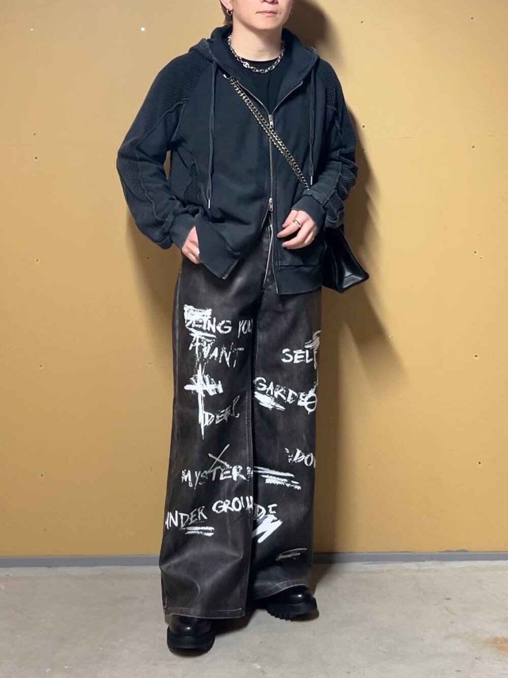 ▼メッシュパーカー トレンドのダブルジップにコンパクトなシルエットと、今年着てたら絶対にオシャレ見えするアイテム! メッシュある部分はインナーが透けるので、中に着るもの次第で雰囲気をガラッと変えられます! 羽織っても良いし、前を閉めれば一枚でも着れるので色んな着方で使えます! ▼パンツ 大胆なペイントデザインで、履くだけでサマになるパンツ! しっかり目の硬いフェイクレザーを使っており、傷や汚れを気にせずガシガシ使えます! また、シルエットもワイドストレートなのでダボっとし過ぎずスッキリ履きやすい!