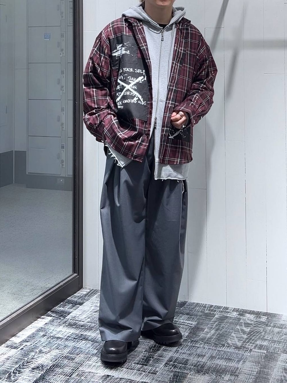 ▼チェックシャツ アングラシリーズのパンクなチェックシャツ! ペイントデザイン✖︎チェックデザインで、差をが出せるアイテム! 限定シリーズのアイテムなので被らないのも嬉しい! サイズもオーバーサイズなので、羽織っても着ることができます ▼パンツ ボリュームのあるワイドシルエットのスラックス! 腰回りのタックが深めに入っており、一見シンプルですがタックインした時に差が出せる! ウエストもゴムなので履きやすいのも嬉しいところです! シーズン問わず使うことができますよ!