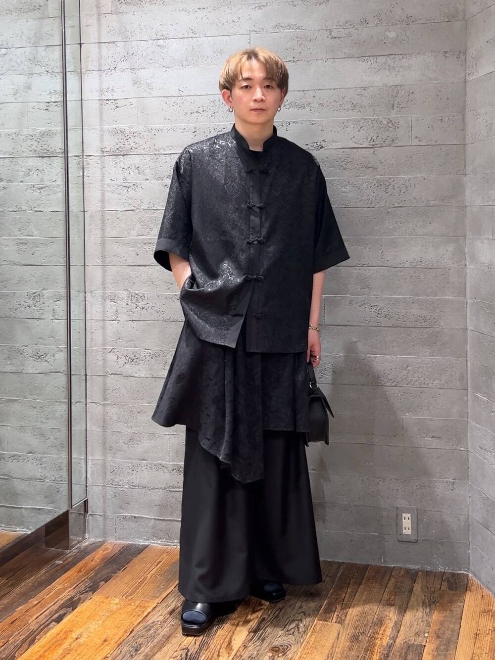 【チャイナシャツをモードに着こなす】 🔻シャツ メンズでは珍しいチャイナボタンのシャツ! 前を閉めて一枚で着るだけでもグッとオシャレな雰囲気が出ます! 光沢のある上品な生地を使っており、光が当たった時の感じがめちゃくちゃキレイ!🐴 サイズ感もゆったり目なので、気兼ねなく着れるのも嬉しい!! 🔻パンツ スカートをレイヤードしたモードなパンツ! 低身長でもスタイル良く着こなせるパンツです! ウエストにはゴムが入っており、体型問わず誰でも履きやすいです! ドレープ感のある生地を使っており、服の揺れ感がとてもキレイです!