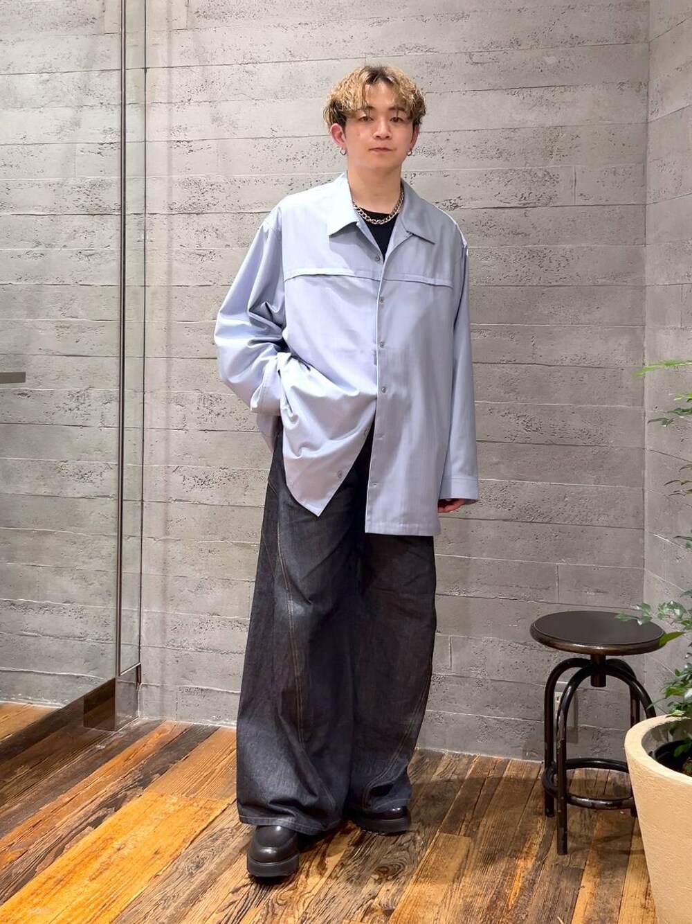 🔻シャツ しっかりとした厚手の生地で、オールシーズン使えます! シワにもならないですし、型崩れもしづらいです! オーバーサイズで丈も長め! 一枚で着る時は、裾のボタンは開けて着るのがおすすめです! ストライプの主張も強すぎないので◎! 🔻パンツ 立体的なカーブシルエットなデニムパンツ! このカラーはリジット加工をしており、使い込むほど柔らかくなり、味が出ます! 育てる感覚もあるのが◎! シーズンは通して使えるので、長い目で見ればコスパも◎!
