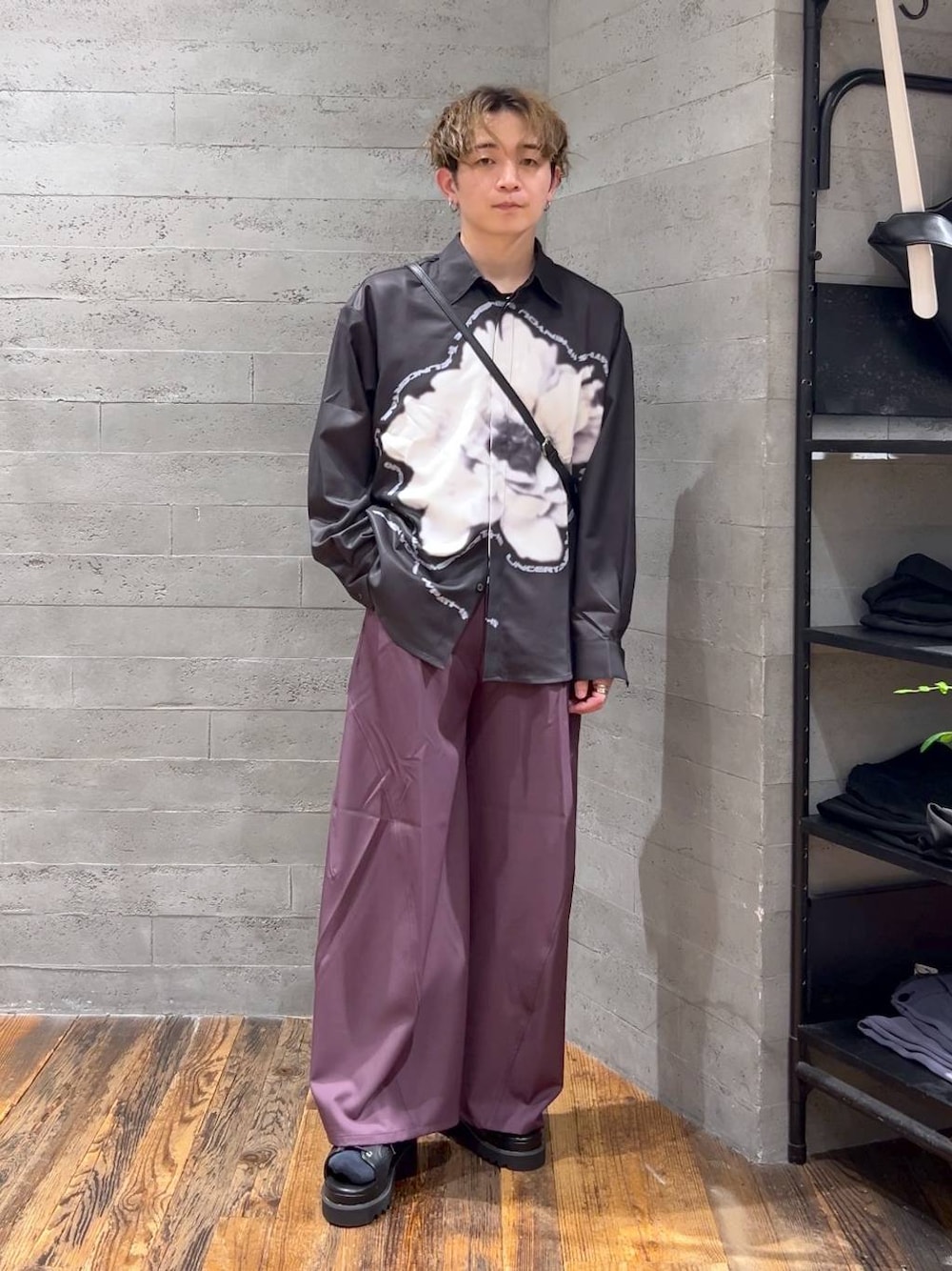 ▼シャツ フロントのプリントデザインは他になく、着るだけで周りと差別化できるシャツ! オーバーサイズでゆったりと着ることができ、着心地も快適です! マットな光沢のある生地で、高級感があり高見えします! シワにもなりづらいデザインで、日頃から使いやすいところも◎! ▼パンツ カーブデザインが特徴的なワイドパンツ! ハリがある生地で、形崩れせずキレイな状態で着こなせます! ウエストにはゴムがあり、ストレスフリーなデザインです! シューズはスニーカーから革靴までなんでも合わせられますよ!