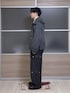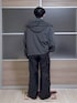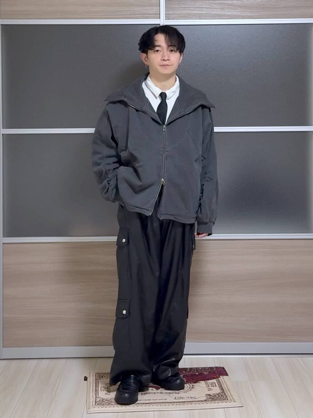 ▼パーカー 実際に着てみると、まず圧倒的に“雰囲気が出る”パーカー。 口元まで閉まるマスク仕様が独特のモード感を出してくれて、普通のスウェットとは全然違う存在感があります。 フードはジップで取り外せるので、マスクパーカー・ジップパーカー・ブルゾン風と、1枚で着方の幅がめちゃくちゃ広いです。 首元と裾のドローコード、ダブルジップ、袖口のギャザーなど、細かいディテールも効いててシルエット調整もしやすい◎ 生地は370gの肉厚裏毛でタフなのに柔らかい着心地。 ウォッシュ加工のリアルな色落ちが深みあるダークグレーで、これ一枚でコーデが完成します。 同素材のスウェットパンツとセットアップで着ると更に雰囲気が出ておすすめです。