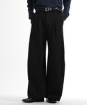 ▼ブルゾン 襟の合成皮革が程よいアクセントになっていて、 シンプルだけどしっかりモード感が出ます。 全体はゆとりのあるシルエットで、 ラフに羽織ってもサマになるのが◎ インナーも選ばず使いやすいです。 異素材切り替えで奥行きが出るので、 カジュアルにもモードにもハマります。 ▼パンツ 履いた瞬間、膝下のボリューム感がかなり印象的。 立体裁断のおかげでワイドでもダボつかず、 自然とモードな雰囲気になります。 トップスをコンパクトにすると、 一気に今っぽいバランスに。 ハリのある素材でシルエットがしっかり出るのも◎