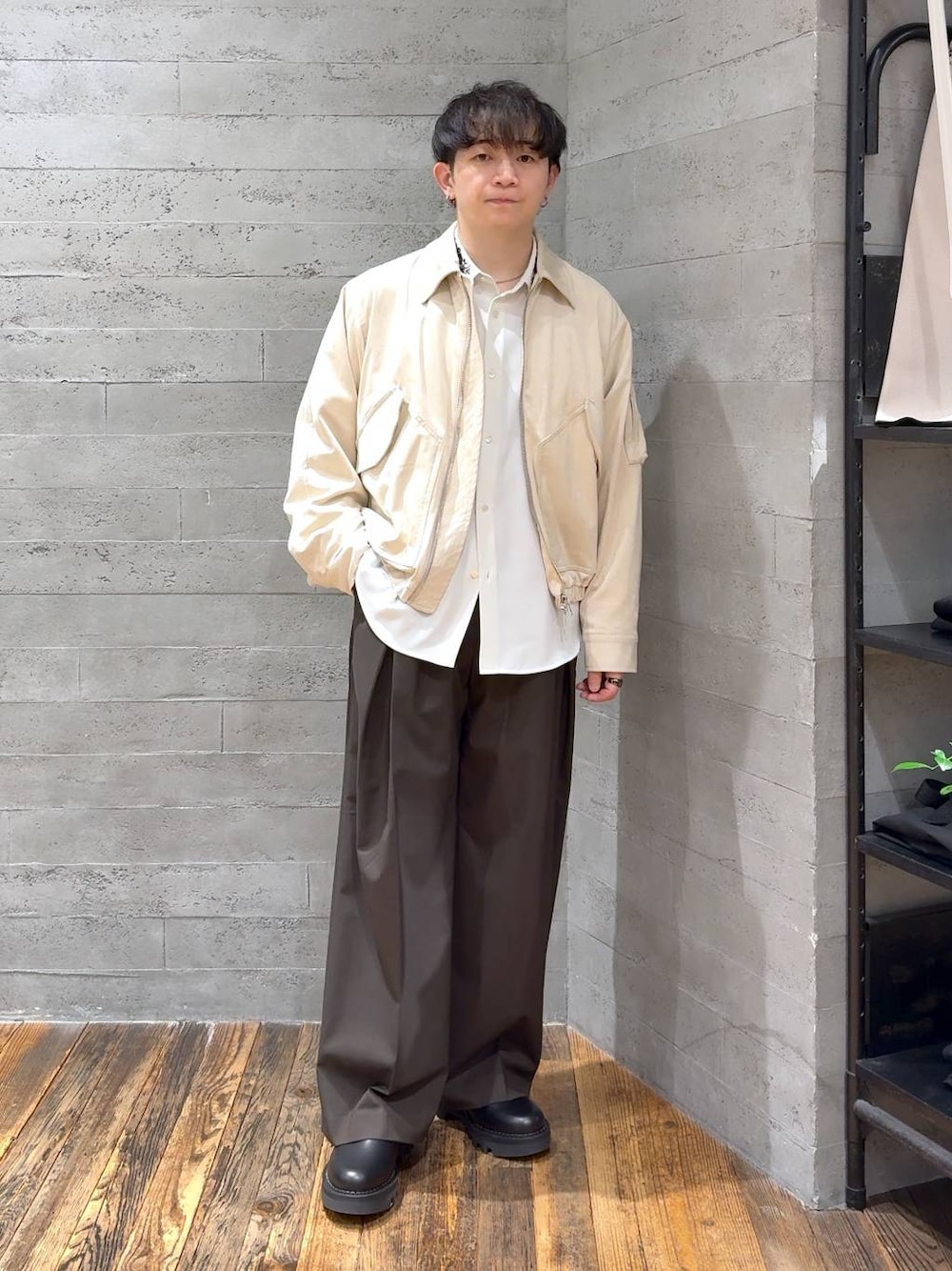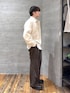 ▼ブルゾン スウェードの素材感が良くて、 パッと見で高級感があるのが印象的。 スウェードは起毛感があって肌触りもかなり柔らかめ。 見た目より軽くて、着心地もいいです。 サイズ感はコンパクトですが、 身幅は広めなのでレイヤードしても窮屈感なし。 裾が絞られている分、スッキリ着られるのも◎ シンプルだけど地味にならない、 使い勝手のいい一着です。 ▼パンツ フロントのタックで縦ラインがきれいに出るので、 ワイドでも脚がスッキリ見えるのが嬉しいポイント。 ストンと落ちるシルエットで、 ラフさはありつつ上品さもしっかりあります。 きれいめにもカジュアルにも使いやすいです。 ウール混TR素材ですが重さはなく、 滑らかで光沢感もほどよい印象。 同素材と合わせると、 セットアップで間違いない一本です。