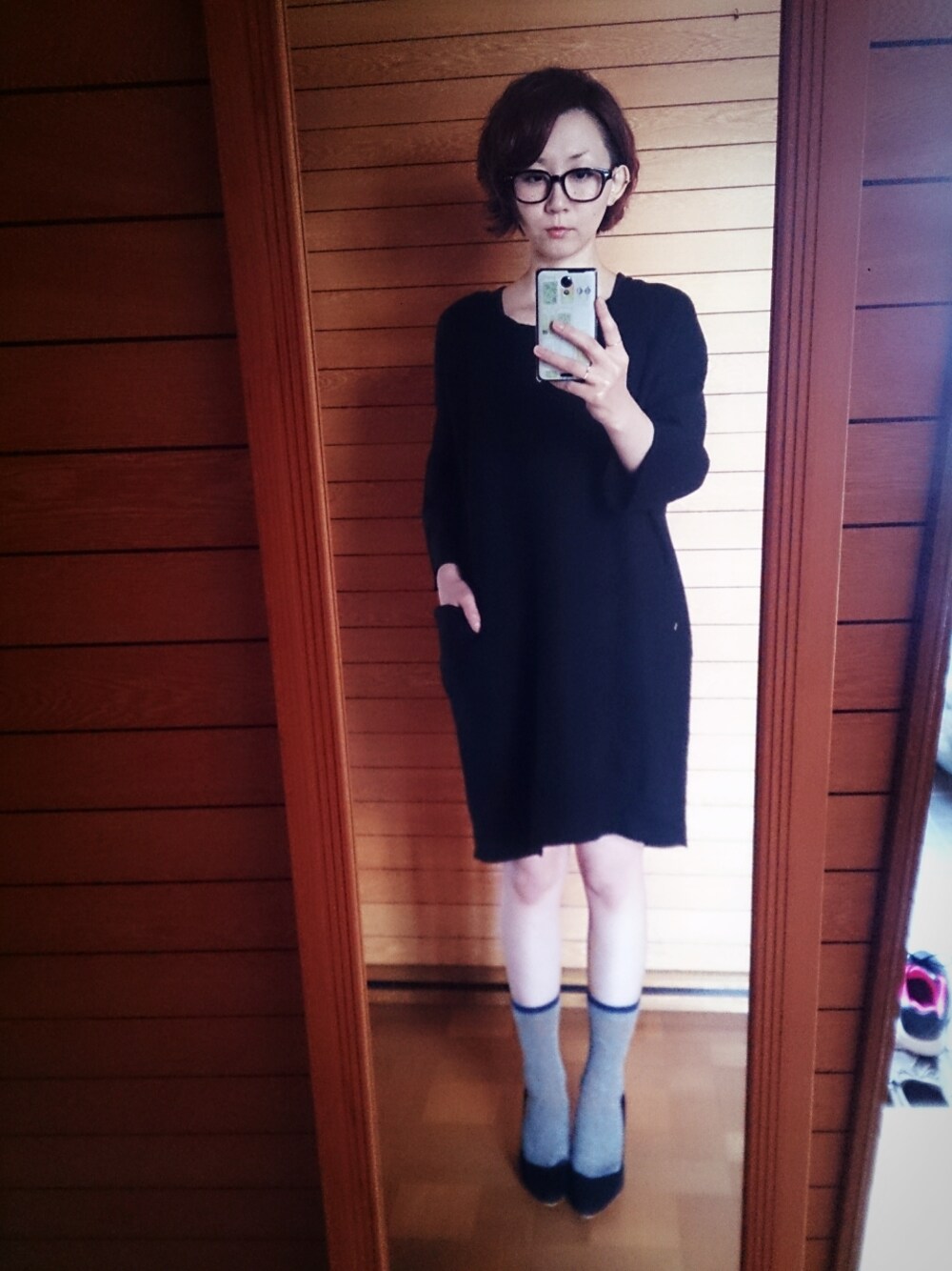 圧縮ウールのシンプル黒ワンピース。 このワンピースね、 ポッケは左側にしか付いてないの。 だからどうした、と言われそうですが だからどうした、と言われそうなものがすき。