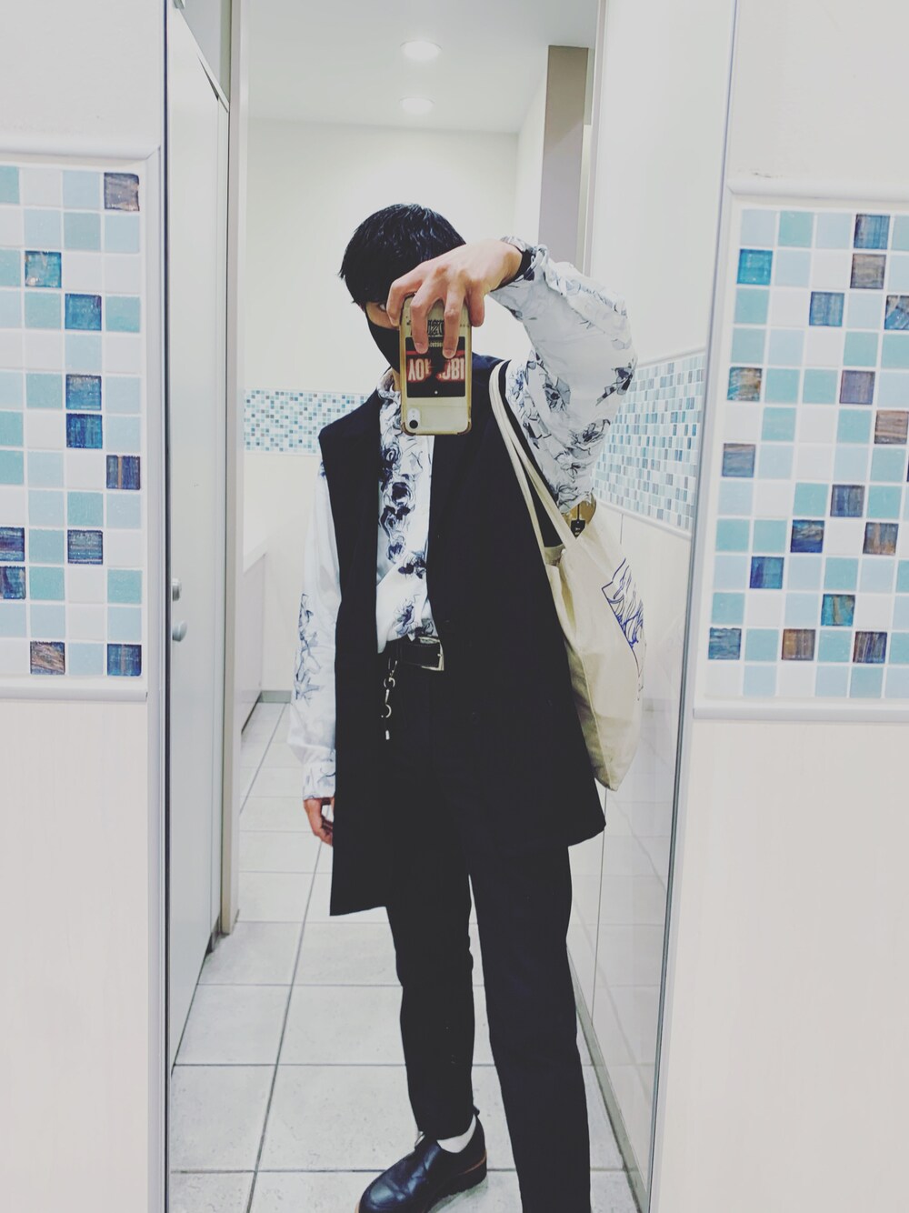 ロングジレに柄シャツを合わせたモードチックながらもシンプルなコーディネートにしました。