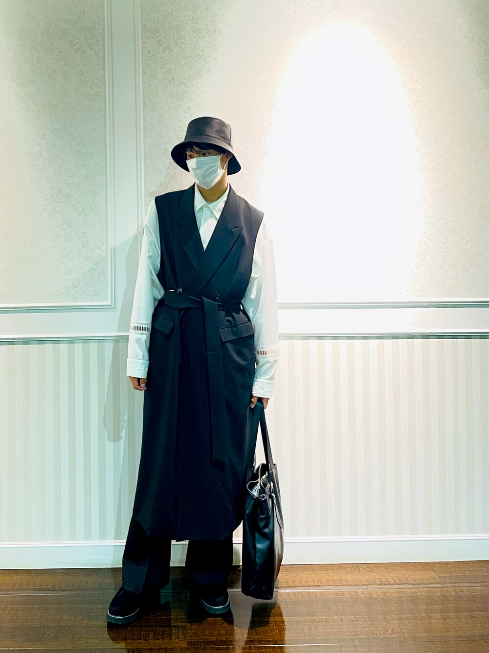 ロングジレを使ったモノトーンコーデ。 最近購入したniko and...の白のステッチ入ったローファーが可愛すぎる! バケハをかぶることでよりモードっぽくしました!