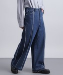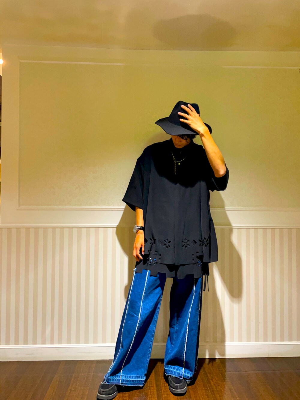 最近トレンドのデザイン性が高いデニムパンツとレザーカットが目を引くデザインのシャツで合わせました! 少しデニムの丈感が長めなのでSでちょうど良いサイズ感です!