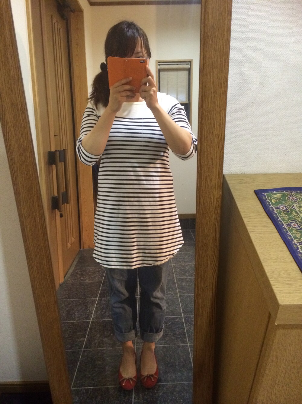 オレンジ系のパンプスを着用したレディースの春コーディネートの1枚目の写真