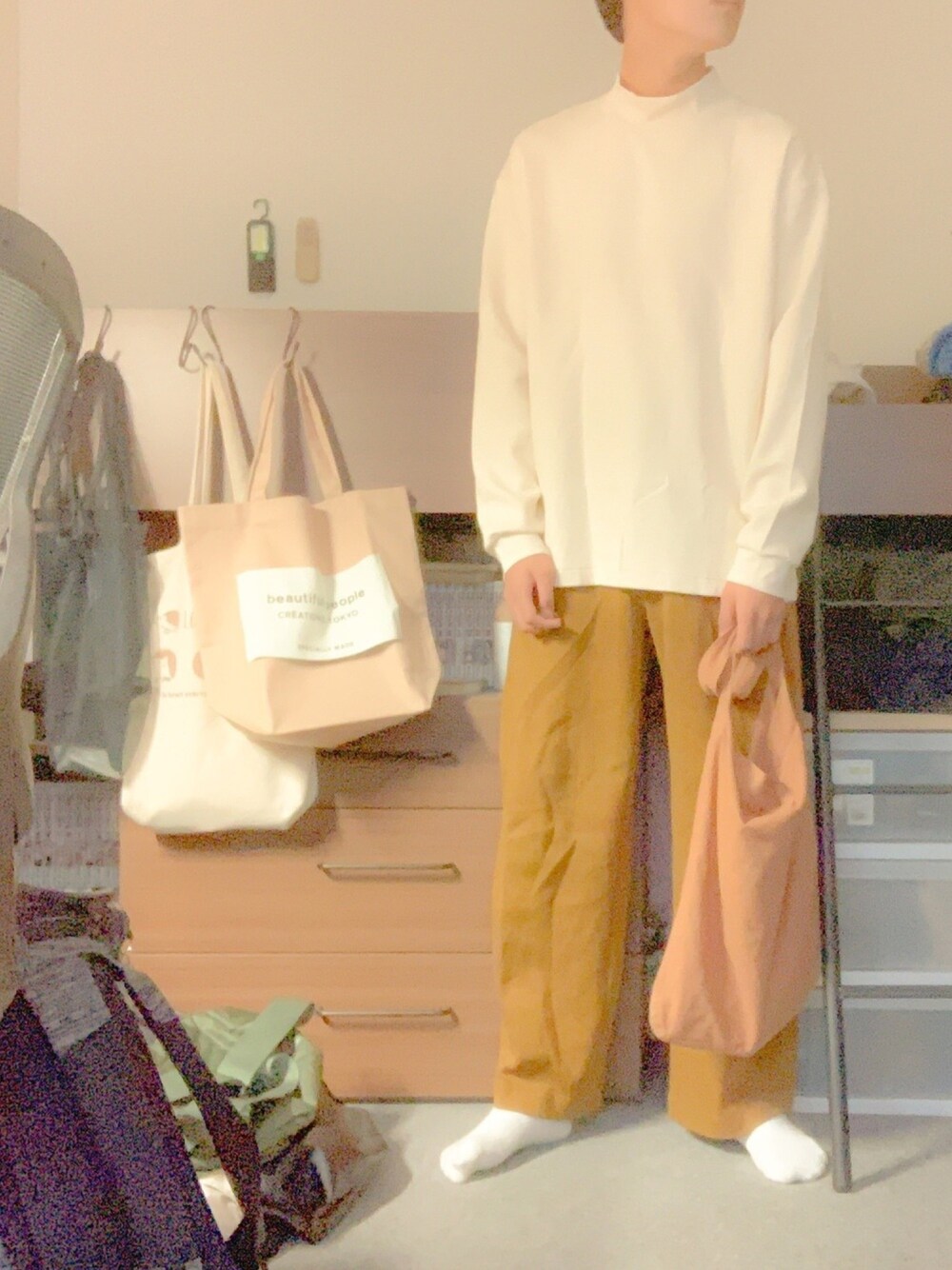 ベージュのモックネックと ブラウンのワイドパンツのコーデ 色味の統一感を目指した ・ ・ ・ 🦔
