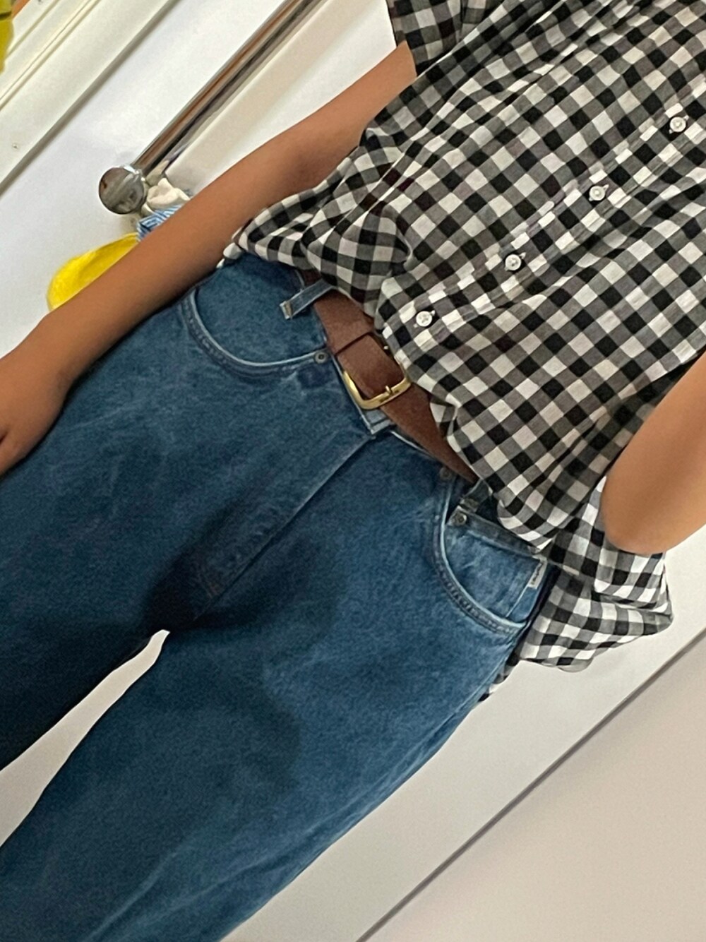 上のTシャツが細い線のデザインなので、ベルトは太い茶色が似合いそう。麦わら帽子👒ぴったりです。