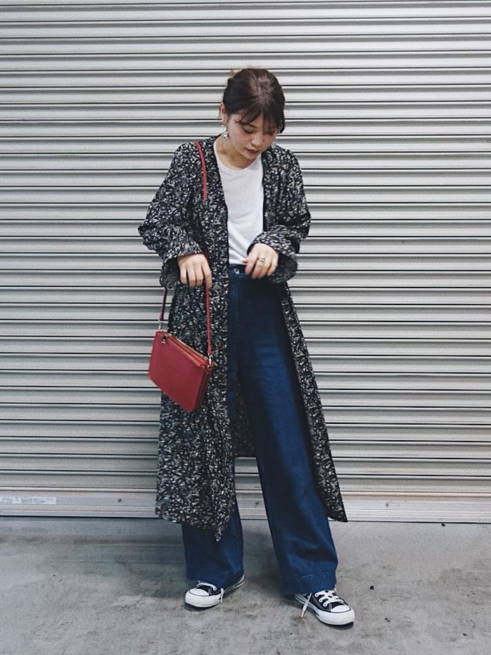 花柄ワンピースをガウンとして🌸 デニムと合わせれば可愛くなりすぎないから好き。 insta▶︎@haruka_mihashi