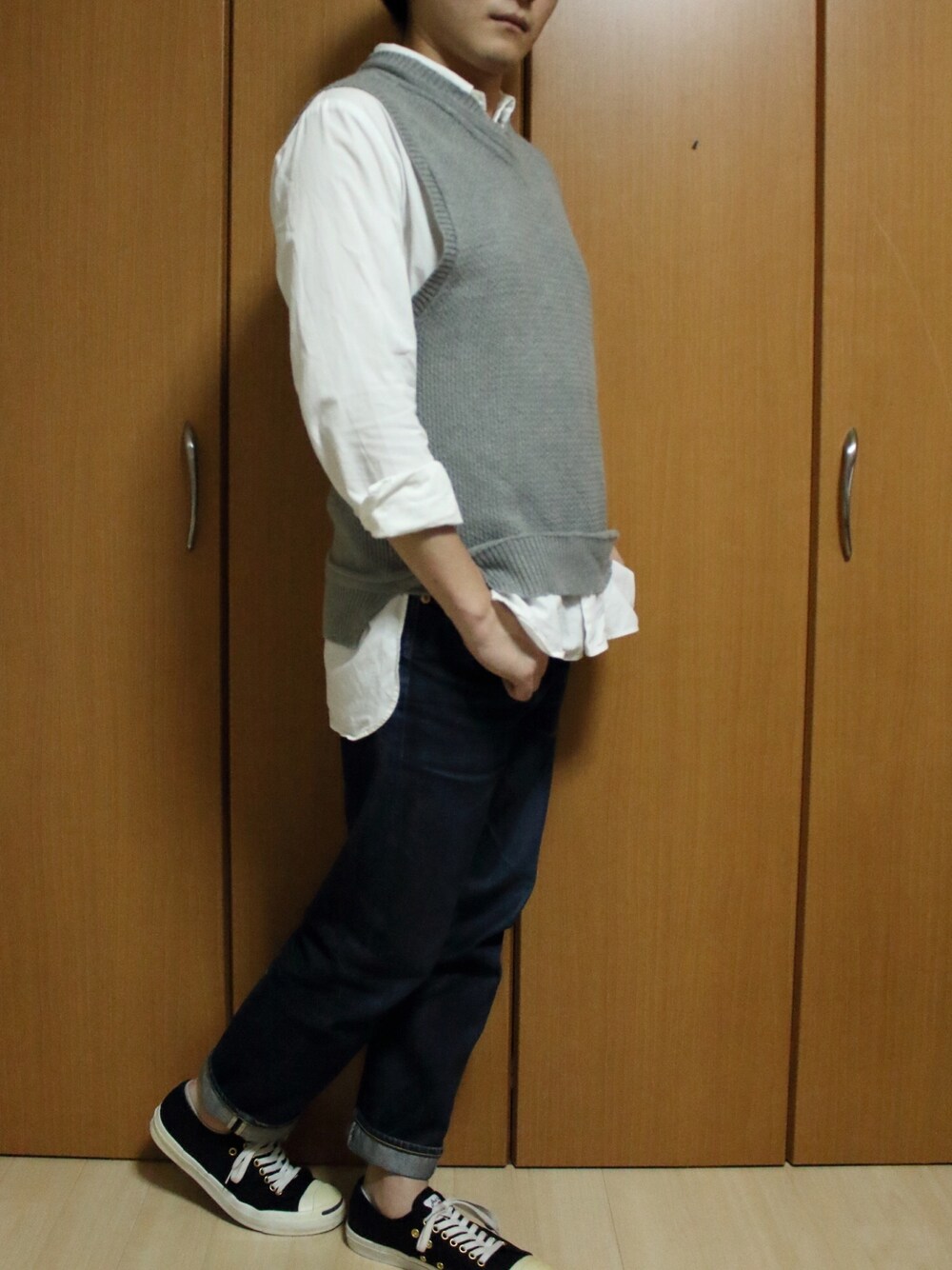 今回はなぜか写真の撮り方悪くて顔入りませんでした笑 よく見かけるニットベストとシャツの組み合わせですが、ロングシャツを外出しにしてみました〜 まあーロングシャツとの合わせも良く見かけるようになりましたが、やっぱおしゃれに見えますよ ね笑 スニーカーはシンプルにコンバースのジャックパーセルです