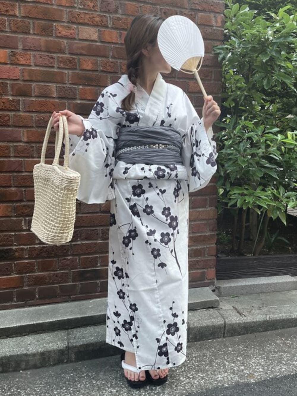 <その他4 梅の花笑み> シンプルが一番かわいい!白・紺・グレーの組み合わせで大人っぽく可愛さをアピールできちゃう浴衣。 全体を淡くまとめるコーディネートが好きなので下駄も白、バッグもアイボリーで淡色コーデにしてみました♪