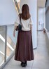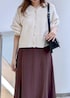ふわふわのショート丈カーディガンとマーメイドスカートを合わせた少しフェミニンな印象のお出掛けスタイルにしました。カーディガンは腰位置くらいの短め丈で、インナーにシャツや薄手のニットを入れると冬まで使っていただけます。