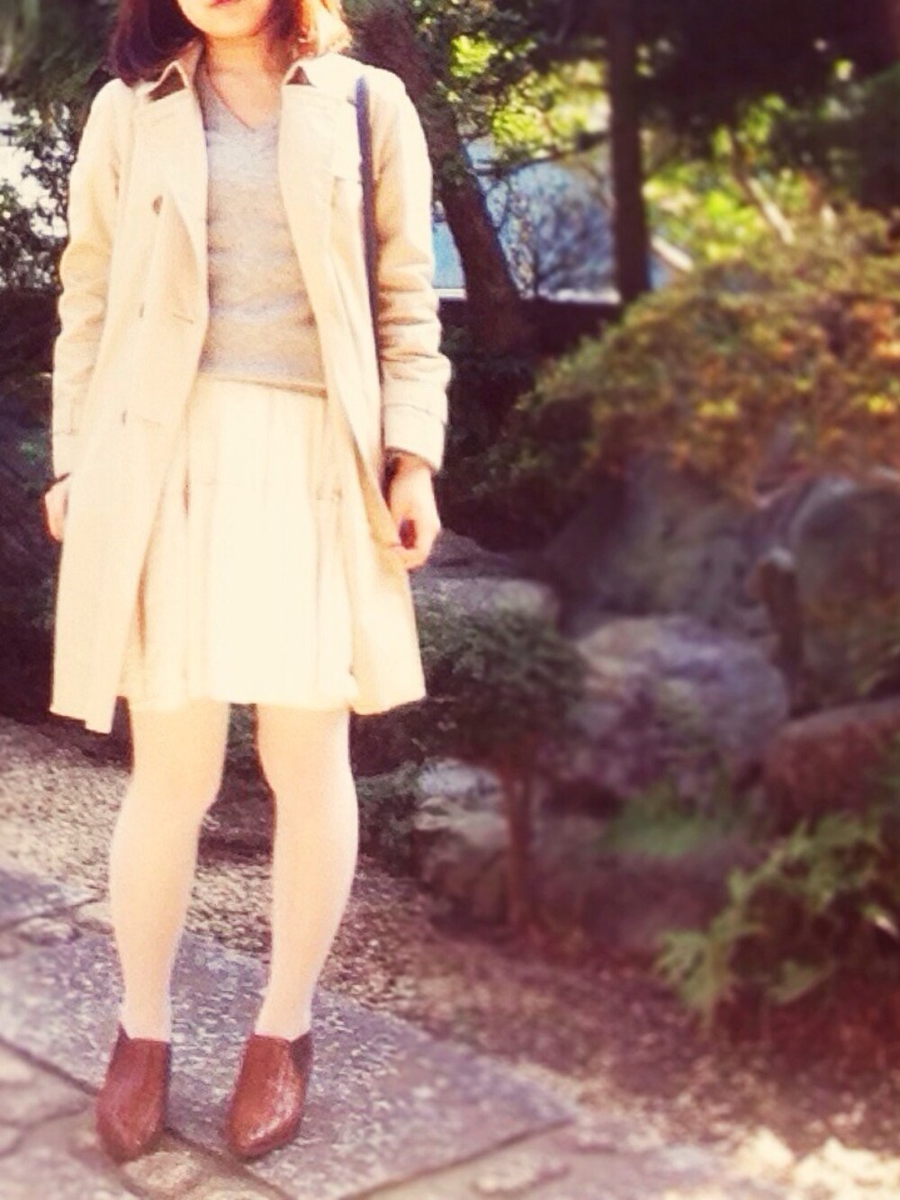 トレンチコート カシミアVネックニット 白ワンピ 白タイツ ブーティ
