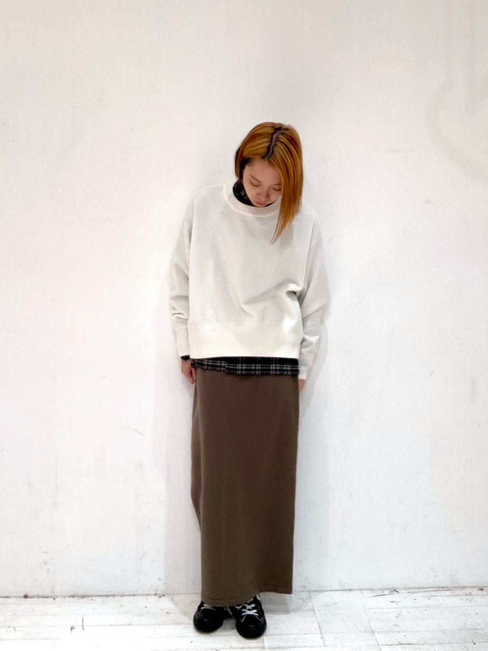 200日ニットのスカートは ストレートシルエットで すっきり見えです◎ チェックシャツは ノーカラーなのでレイヤードもしやすく 着心地も◎です♪
