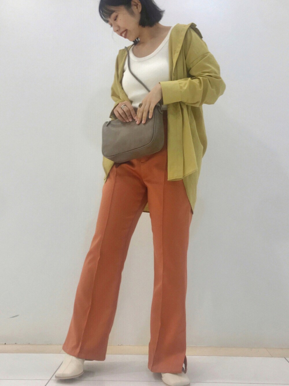 ・トップス 薄手のシャツなので、今の時期に大活躍🙆♀️たすき掛けしても洗濯しても、シワにならないのが本当にありがたい😭 くすみの入ったイエローで幅広い年代の方に着ていただけます。 ・パンツ センタープレスのフレアパンツ。ポケットもしっかりついてます🌷なによりもオレンジのカラーがとっても可愛い!!🍊🧡 太ももまわりもゆったりしているので、足に自信のない私でも綺麗に履けました🙆♀️低身長さんは、厚底やブーツとの合わせがオススメです!