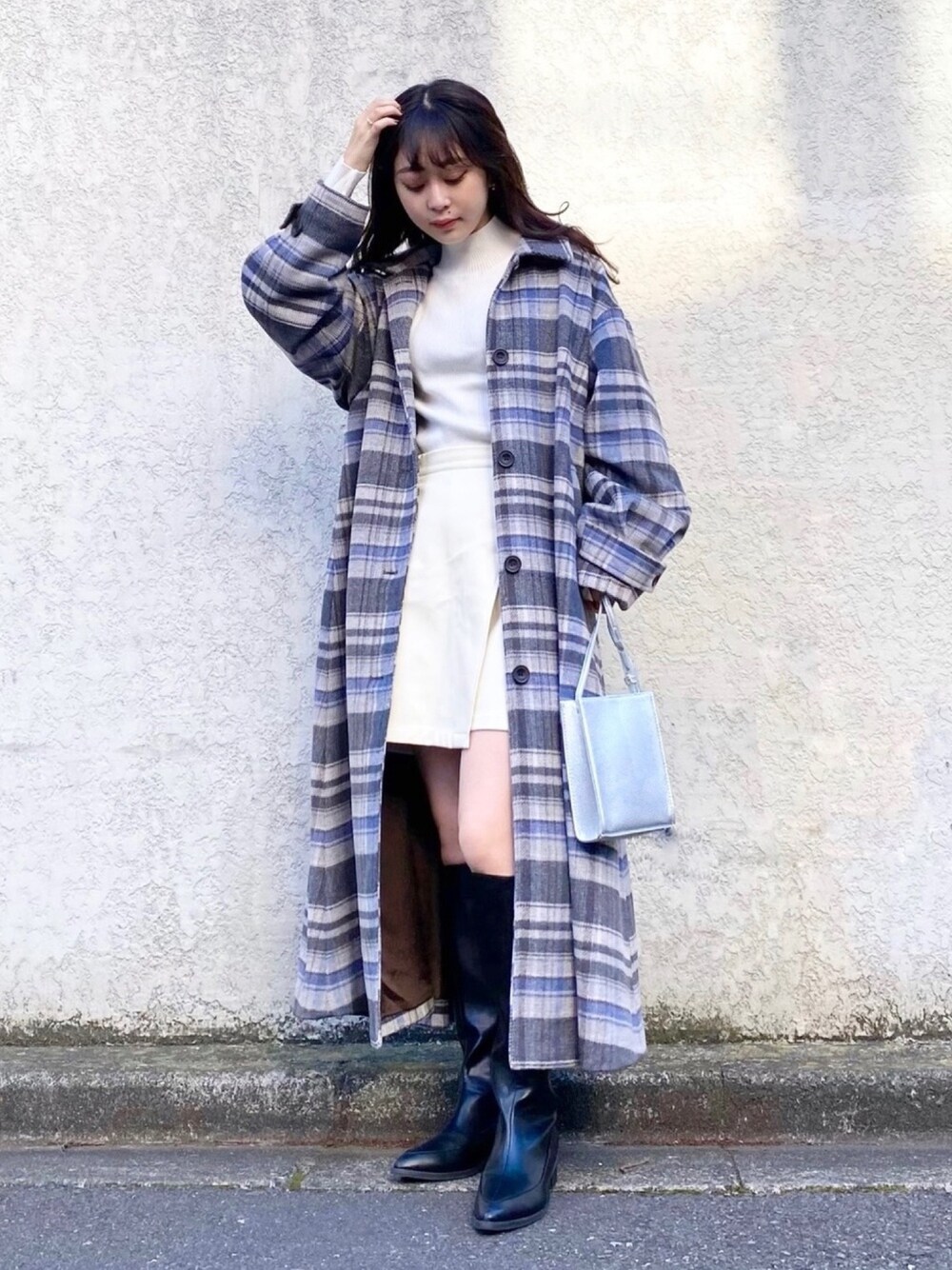 インナーをシンプルにして チェックのコートが映えるようなスタイリングにしました! ミニボトム×ロングコートで 縦のラインを意識して着痩せコーデ。 さらに、足を細く見せるために筒太めのロングブーツを。