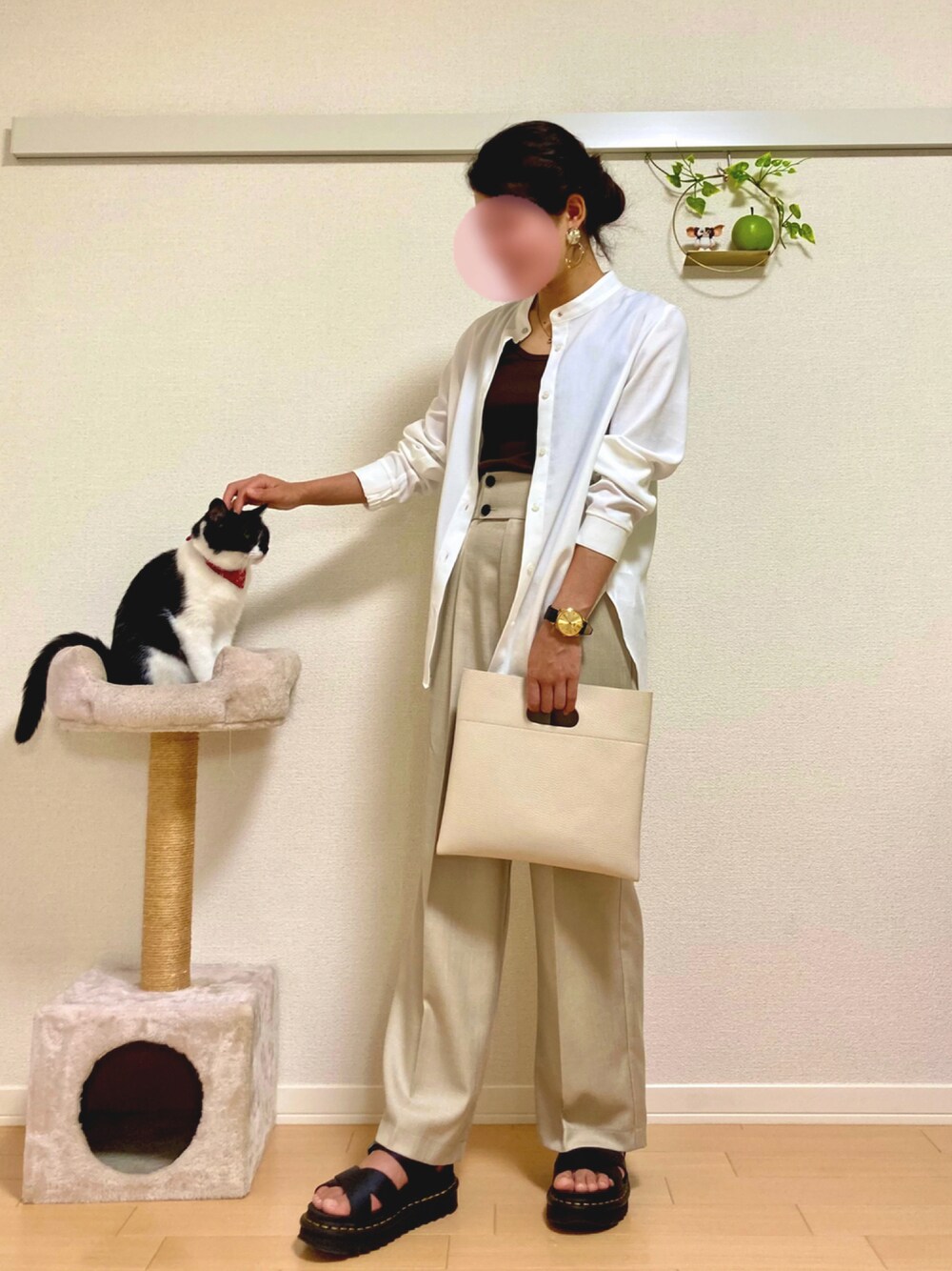 まだまだ暑い日が続きます😵 シャツにブラウンのタンクトップで少し秋っぽさを出してコーディネート組んでみました🍂 おうちの猫ちゃんとツーショット☺️
