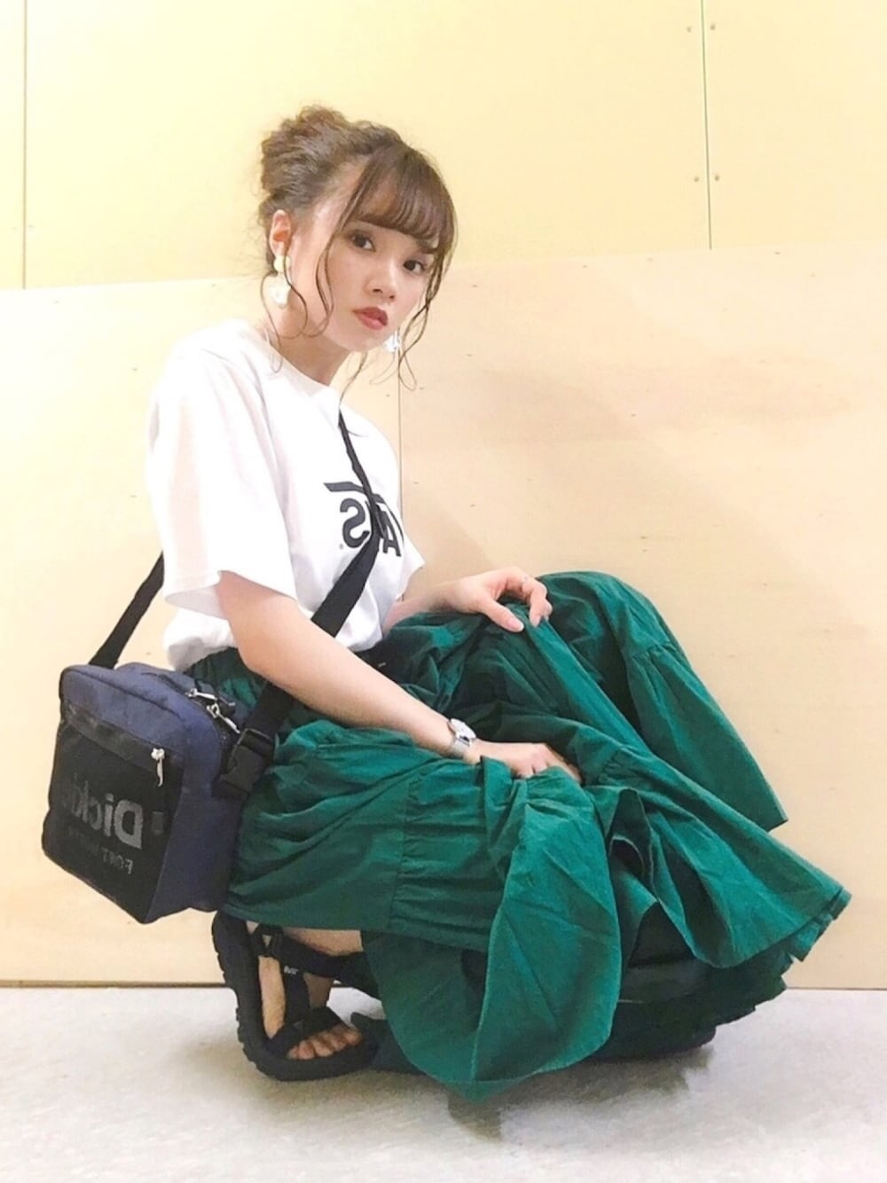 ロゴTにロンスカの相性抜群🌼 『VANS×earth Tシャツ』 胸元に大きく入ったVANSのロゴが可愛い✨ 『カラーティアードスカート 』 このスカート全色すき😂💓 ティアードのボリューム感が絶妙に可愛いくておススメ!