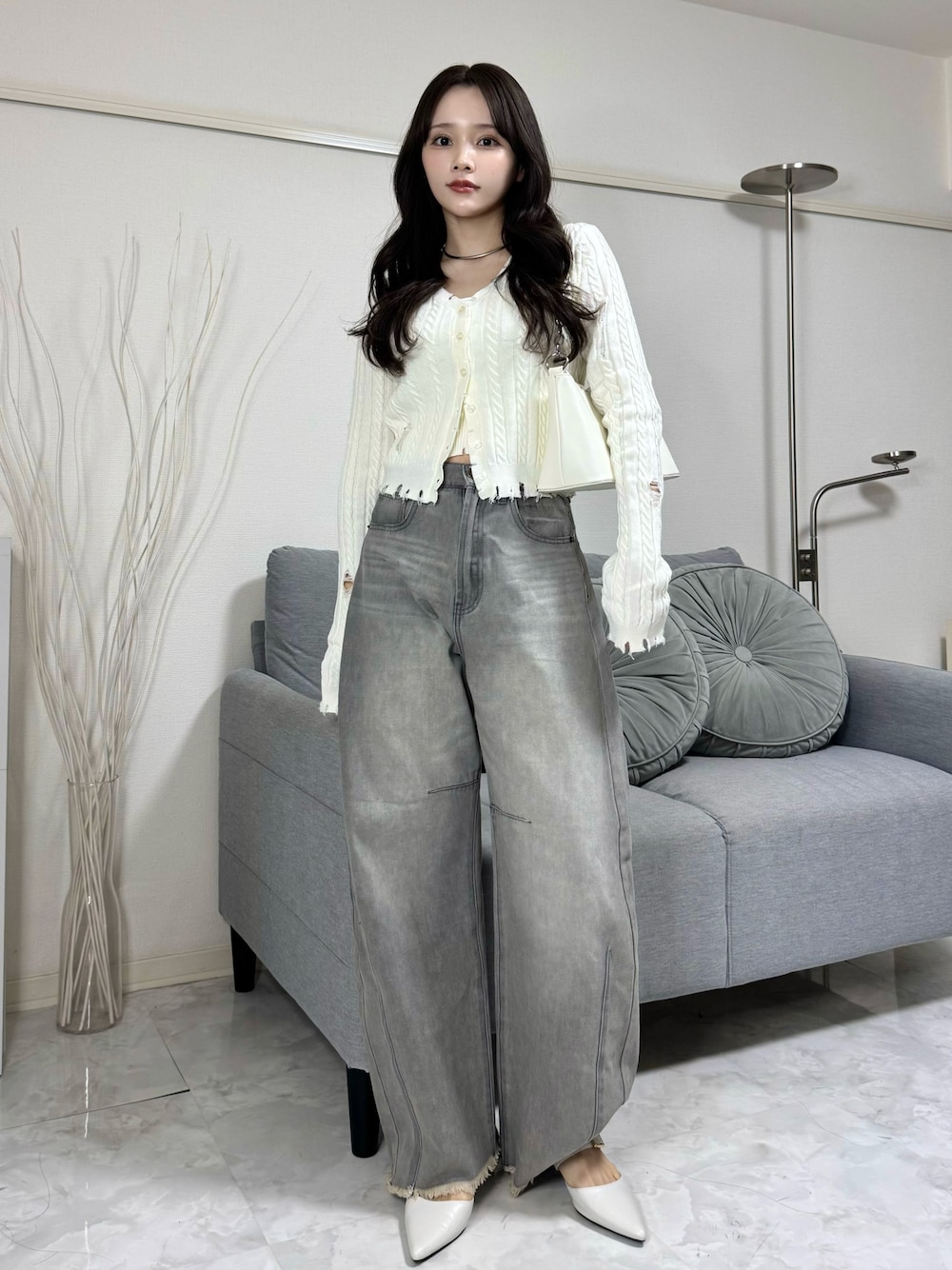 Harukaのデニムパンツ「[販売枚数9万枚突破][お気に入り登録数12万突破][トレンドNo.1デニム][全骨格美脚見えシルエット][サイズ別/身長別画像あり][低身長/高身長/大きいサイズ有][DENIM COLLECTION]裾フリンジバレルレッグデニムパンツ」を使ったコーディネート