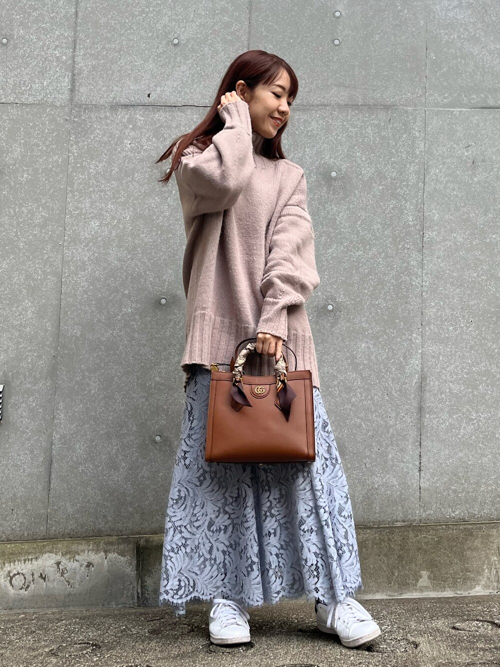 セール購入品のセルフォードのスカート30%OFFだった♬ レーススカートをスニーカーでカジュアルダウン! ニット:Emma Taylor スカート:セルフォード バック:グッチ ブーツ:アディダス Instagram:@harukambo