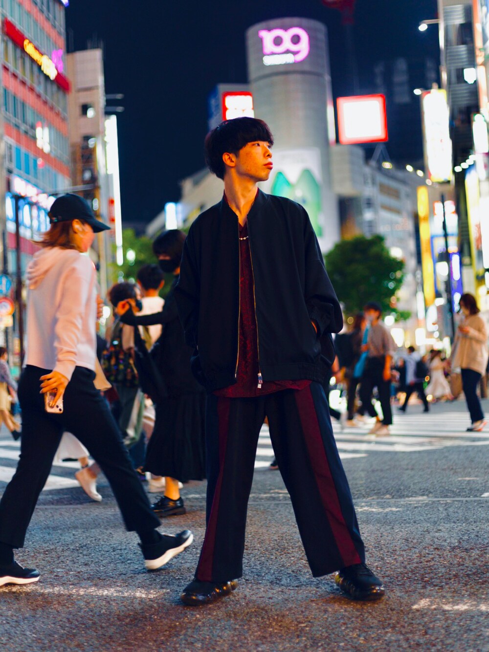 5月の渋谷スクランブル交差点での撮影にて. SHAREEFのカラー切り替えパンツにSISEの王道ブルゾン. シャツはワインで統一感を○ シューズはクッション性抜群&コーデに使いやすいgroundsのニットスニーカー.