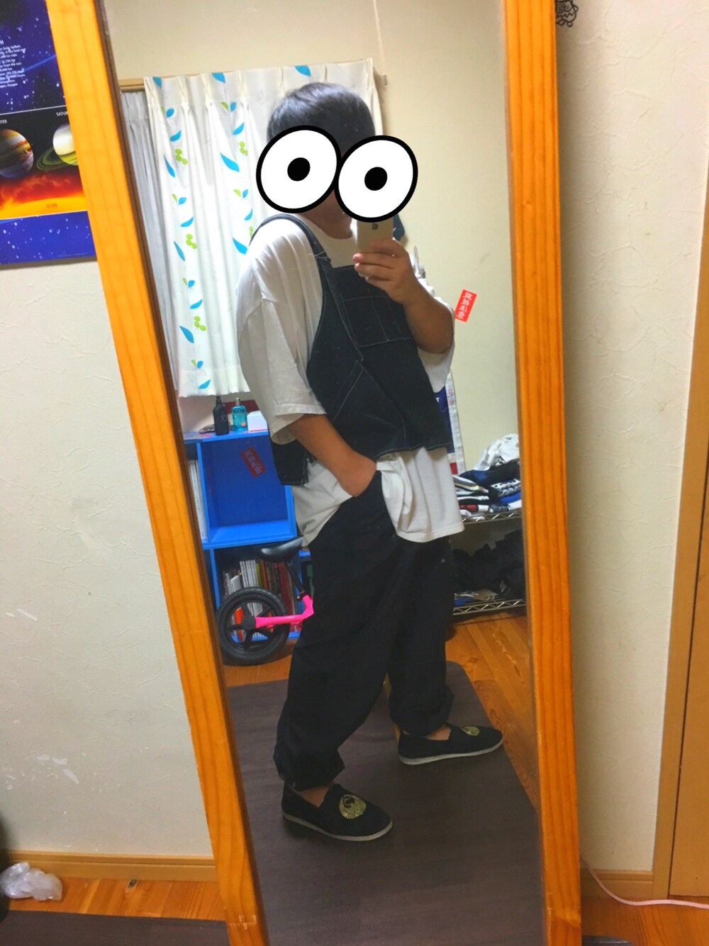 supremeのサスクワッチのカンフーシューズに合う形のパンツでコーデ。 トップは白Tに古着のベスト?みたいなの。
