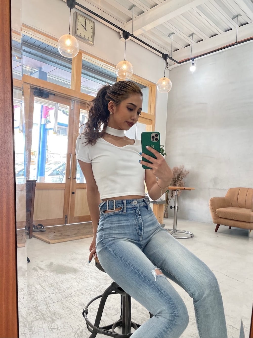 GYDAらしいセクシーな夏コーデです!TOPSはGYDAで大人気のチョーカーデザインのVネックのシルエットになったTOPSです!レーヨン素材なので、伸縮性もあり着やすい一枚です。デニムはウエストのサイドベルトデザインがポイントのスキニーデニム合わせです。