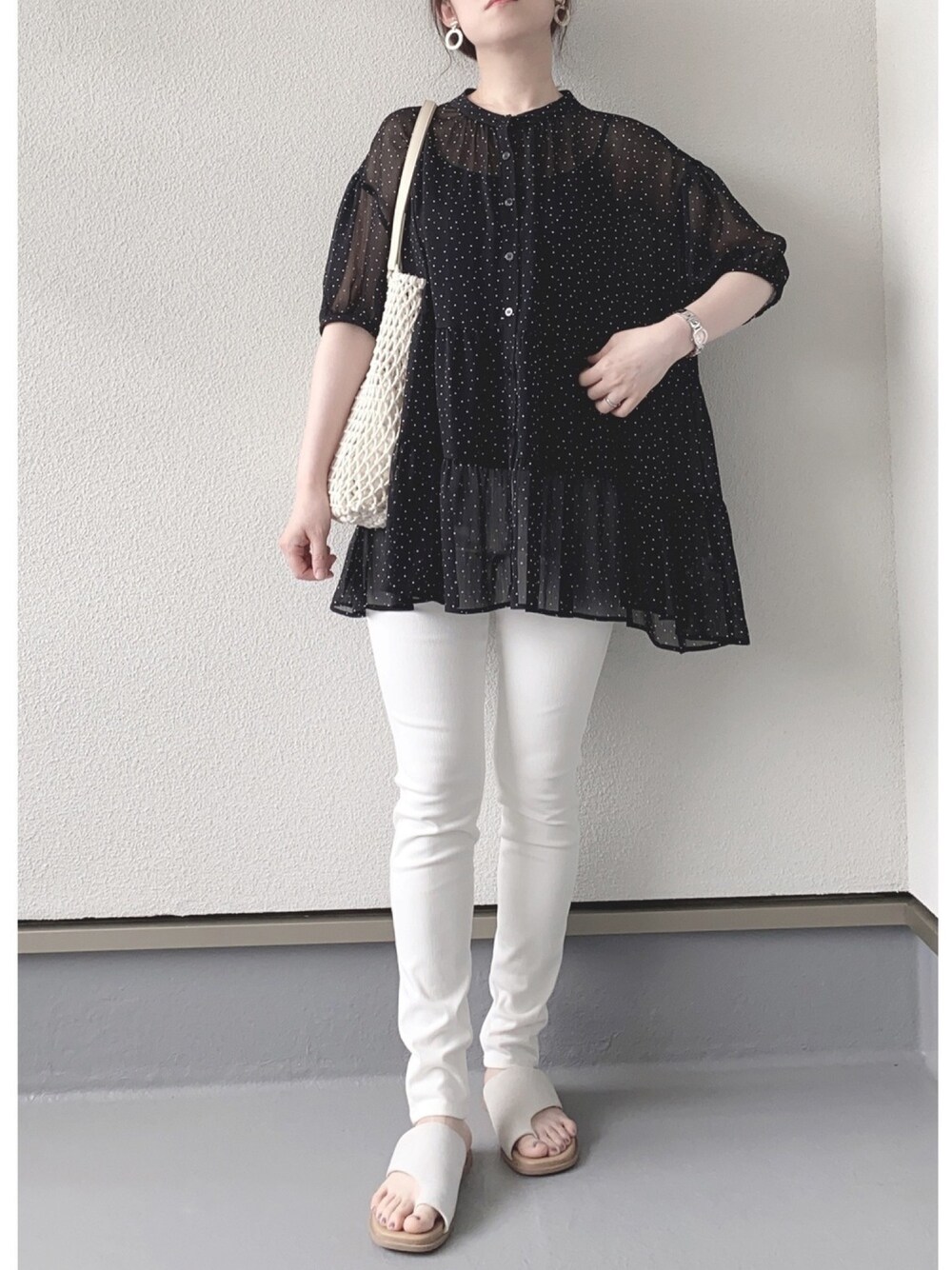 ご覧いただきありがとうございます! しまむらのドットプリントシアーシャツにユニクロのホワイトレギンスパンツでシンプルに♬ いいね、お気に入り、フォローとても嬉しいです✨ 前回のコーデを素敵なフォルダに入れていただきありがとうございます☺️