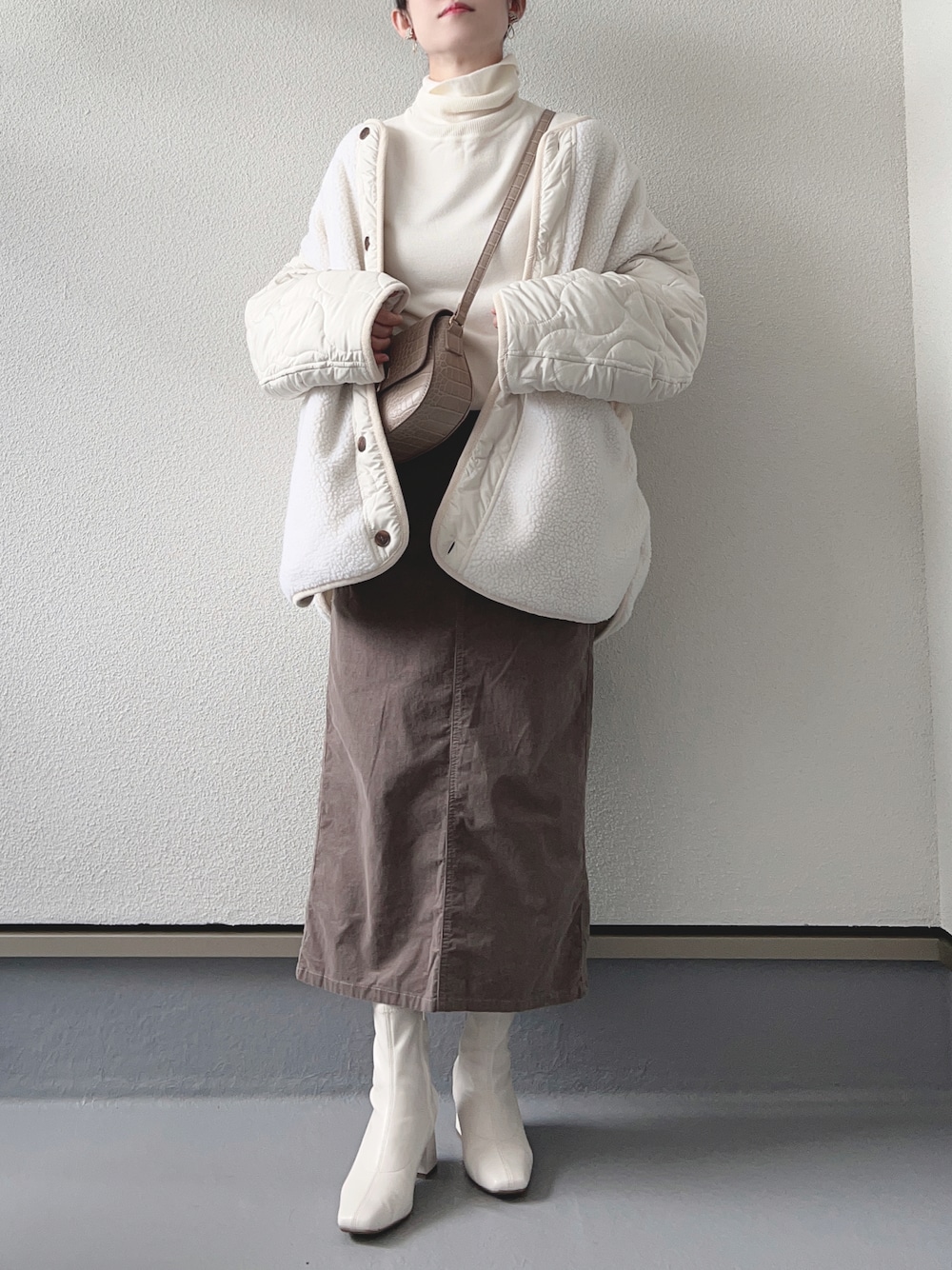 haruのノーカラージャケット「【miho.a.nicoコラボ】キルティングジャケット」を使ったコーディネート