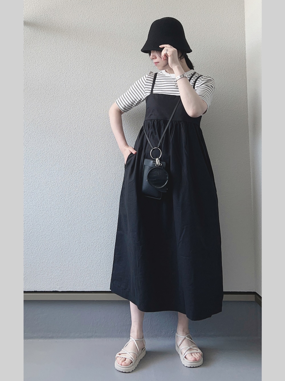 ご覧いただきありがとうございます😊 モノトーンコーデ★⭐︎ 🏷CLEA 【コットンバケットハット】 切り返しのないデザイン、こなれ感のあるバケハ🌟 波打ったような編みデザインはシンプルすぎず、程よくコーディネートのアクセントになってくれます。 紫外線が気になるこれからの季節に大活躍間違いなし! ベーシックなハットでカジュアルコーデにもきれいめコーデにも◎ 【クロスストラップ厚底サンダル】 カラー:アイボリー サイズ:XL *華奢なナローストラップがポイントのレースアップサンダル* スカートスタイルにもパンツスタイルにも◎ 足裏に当たるクッションが柔らかく履き心地がとても良いのもおすすめポイントです💡 🏷UNIQLO 【リネンブレンドギャザーキャミソールワンピース】 カラー:ブラック サイズ:M ハイウエスト切り替えのふんわりシルエットの可愛いキャミワンピ⭐︎ ウエスト回りをカバーできて着痩せ効果も👏🏻 いいね、お気に入り、フォロー、フォルダインとても励みになります✨ いつもありがとうございます❣️