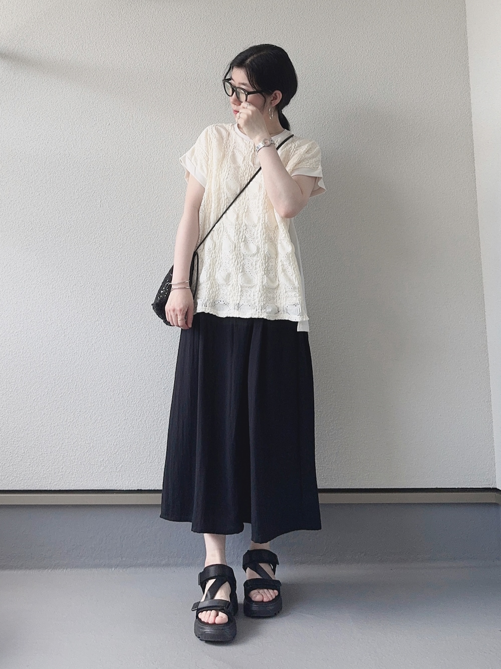 涼しげな夏素材アイテムで楽ちんカジュアルコーデ⭐︎ 前後異素材コンビが魅力のプルオーバーと 接触冷感機能が付きリネンライク素材のスカーチョ🤍🖤 🏷️ ikka 【コスパ最強1990円(税抜)】レースジャガード切り替えプルオーバー 冷感スラブタックスカーチョ いいね、お気に入り、フォローとても励みになります✨ いつもありがとうございます❣️