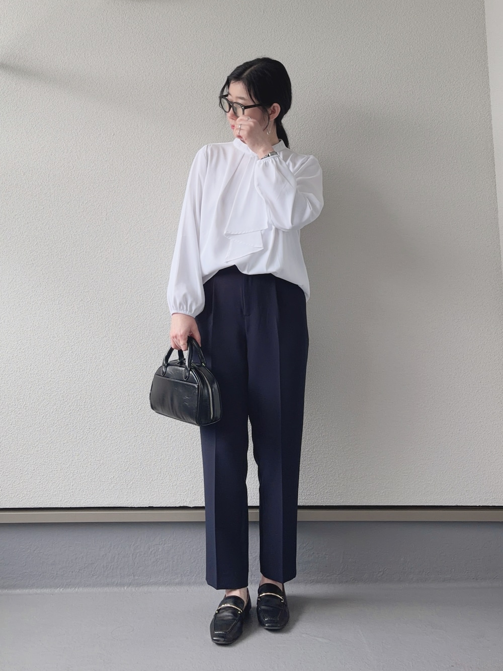 大人可愛いスカーフタイブラウス🤍 一枚でもジャケットのインナーとしても◎ 合わせるアイテムでON、OFFとも使える着回し優秀アイテム💫 ネイビーテーパードパンツときれいめカジュアルコーデ⭐︎ いいね、お気に入り、フォローとても励みになります✨ いつもありがとうございます❣️