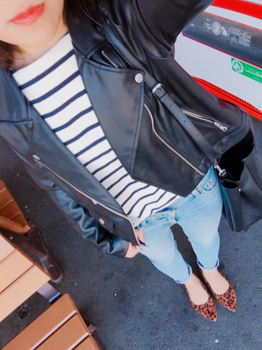 ライダースコーデ! ボーダーとライトブルーのデニムで春らしさもだしつつ。 全体的にボーイッシュ、足元はパンプスにロールアップで足首を出して ちょっと女らしさも出して。 イヤリングと指輪の小物使いで カジュアルだけどオシャレさは抜かりなく。