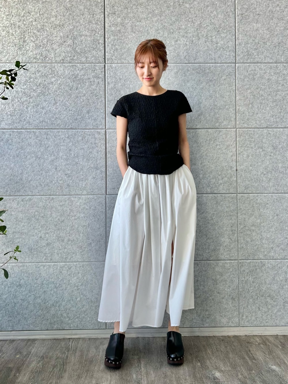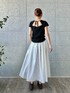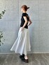 ●femi cut pullover ストレッチ性のある素材で着心地がいいです。 前後ろどちらでも着られるのでスタイルに合わせて印象が変えられるのが嬉しい♡ 紐の結び加減で開き具合も調整できるのでそれぞれの体型に合わせて着こなしやすい一着です。 コンパクトな着丈なのでアウトで着てもスタイルよく着られます。 ●side slit volume skirt ボリュームがありますが生地が軽いので真夏でもサラッと着られそう。 ウエストはゴムになっていて楽チン。サイドのスリットが今っぽいアクセントに。 スリットがファスナーになっているのでスリットの深さが調整できる優秀さ◎。 女性らしく着られるのでオンオフでおすすめです。