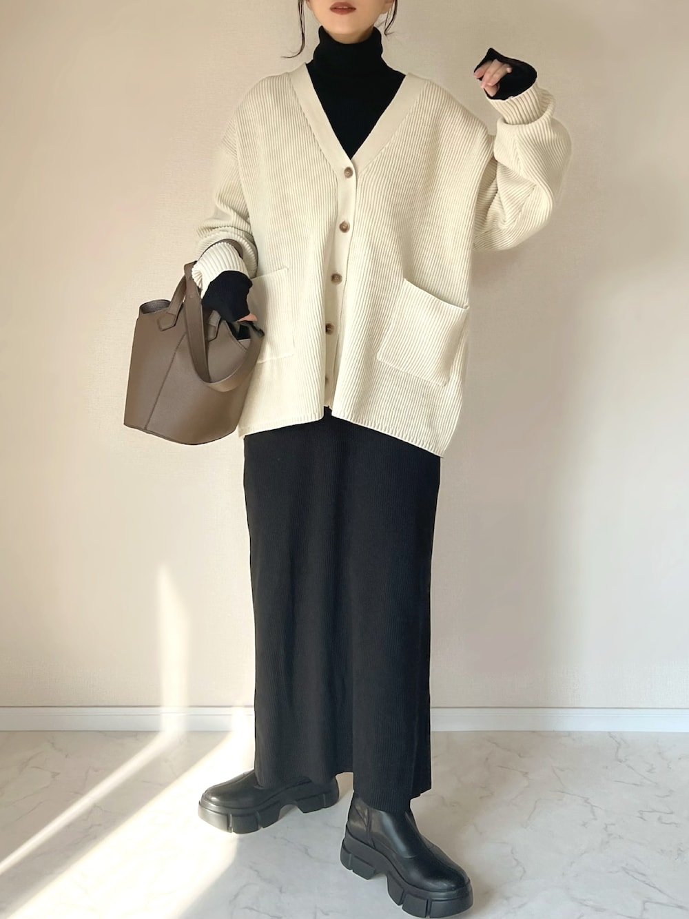 haru のカーディガン/ボレロ「畦編みVネックBIGカーディガン」を使ったコーディネート