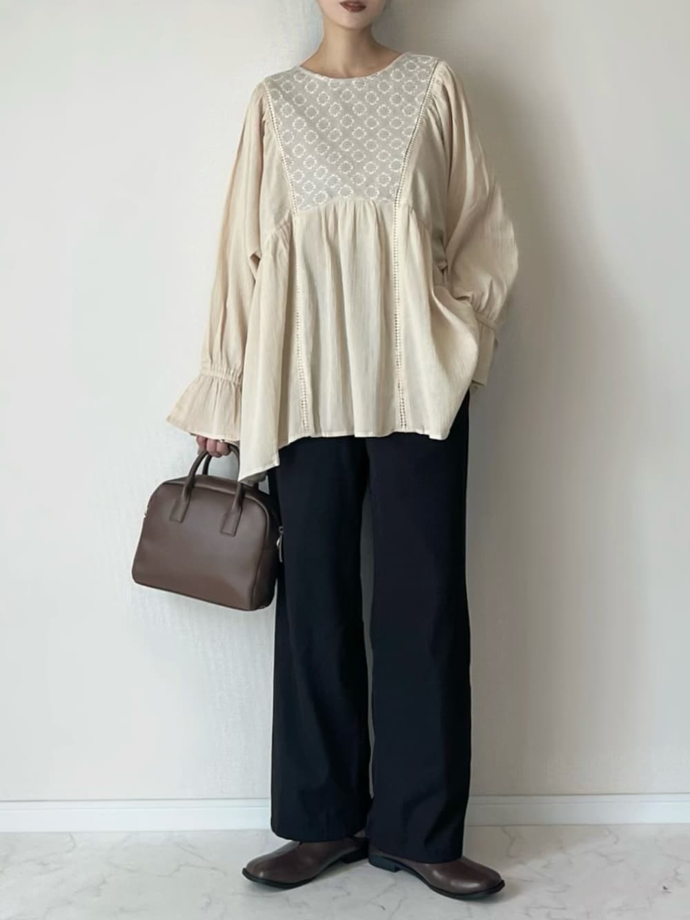 haru のチュニック「フラワーブルームギャザーチュニック」を使ったコーディネート