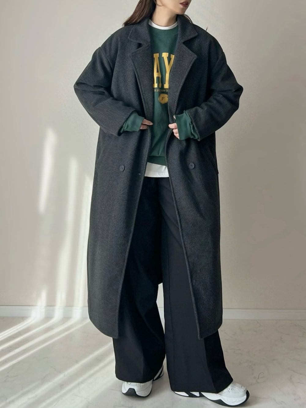 haru のチェスターコート「洗練された 冬スタイルを彩る。 フェイク ウール ベルト付き ダブル チェスター コート(ロング丈)」を使ったコーディネート
