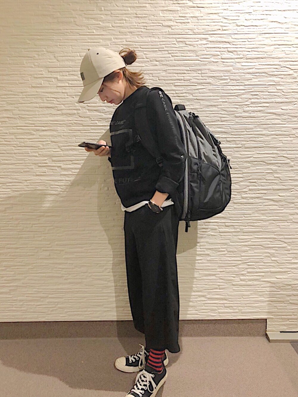 出勤コーデ🔥🔥. . 私服は黒、ネイビー、グレーが多め。 普段は綺麗めが好きですが、、 . . メンズライクなコーデもよくします😆 帽子やソックス🧦で色物を入れるスタイルが好きです❤️. . アンダーアーマーのTシャツは少し丈が長いものが多いので普段着としてレイヤードして使うことが多いです😌 ウーマンズならサイズアップするかメンズのSMを着用してます👍. .