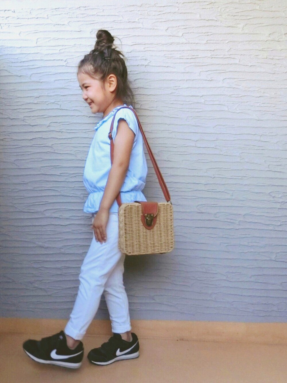 今度はブルー×ホワイトで♡♡ 可愛いトップスにはかごバッグが映える🙆🏻💕 足元はスポーティーにしてみました😝 真面目なコーデのお話……笑 ✾✾ 見て下さり、ありがとうございます♡♡